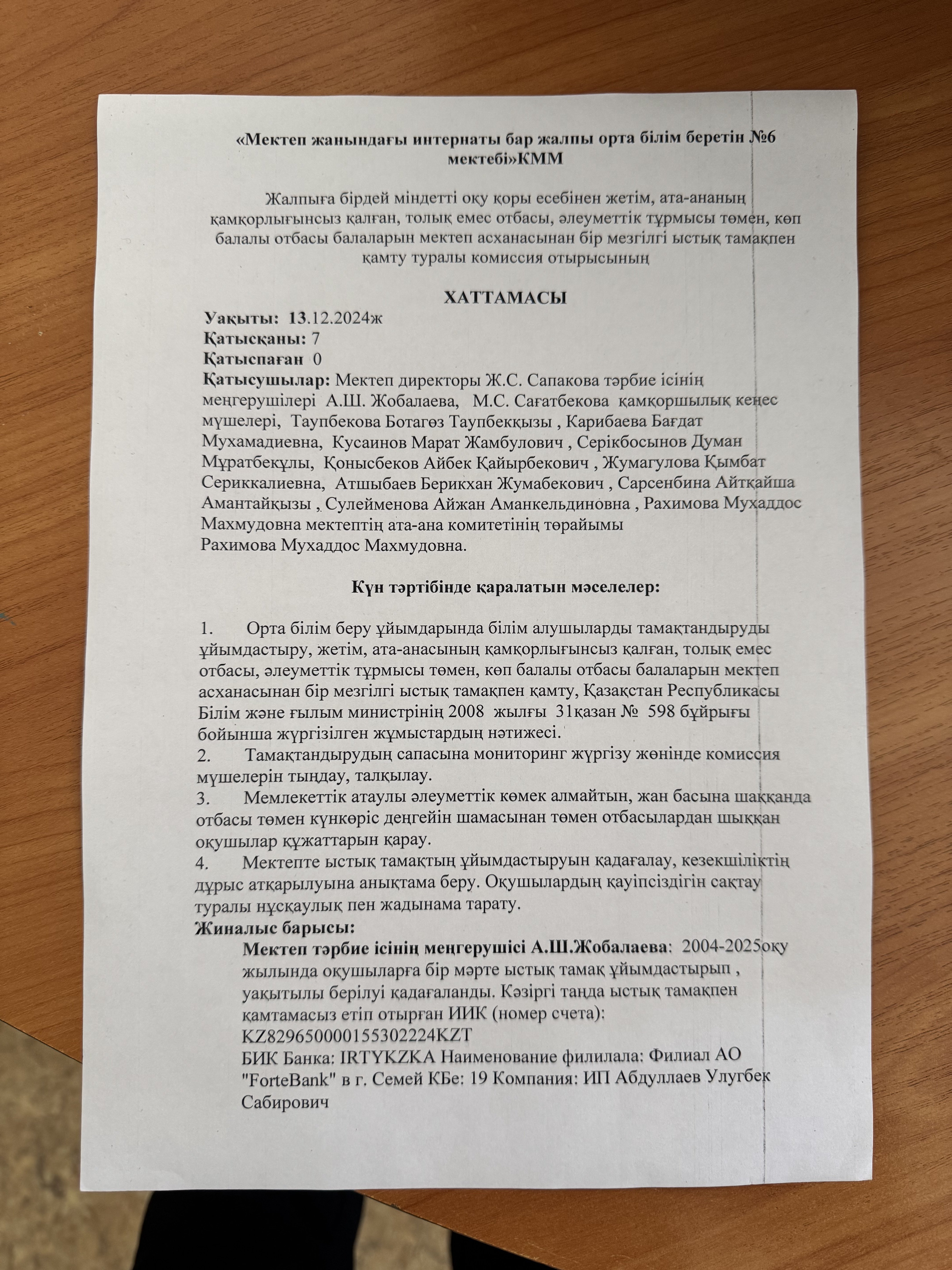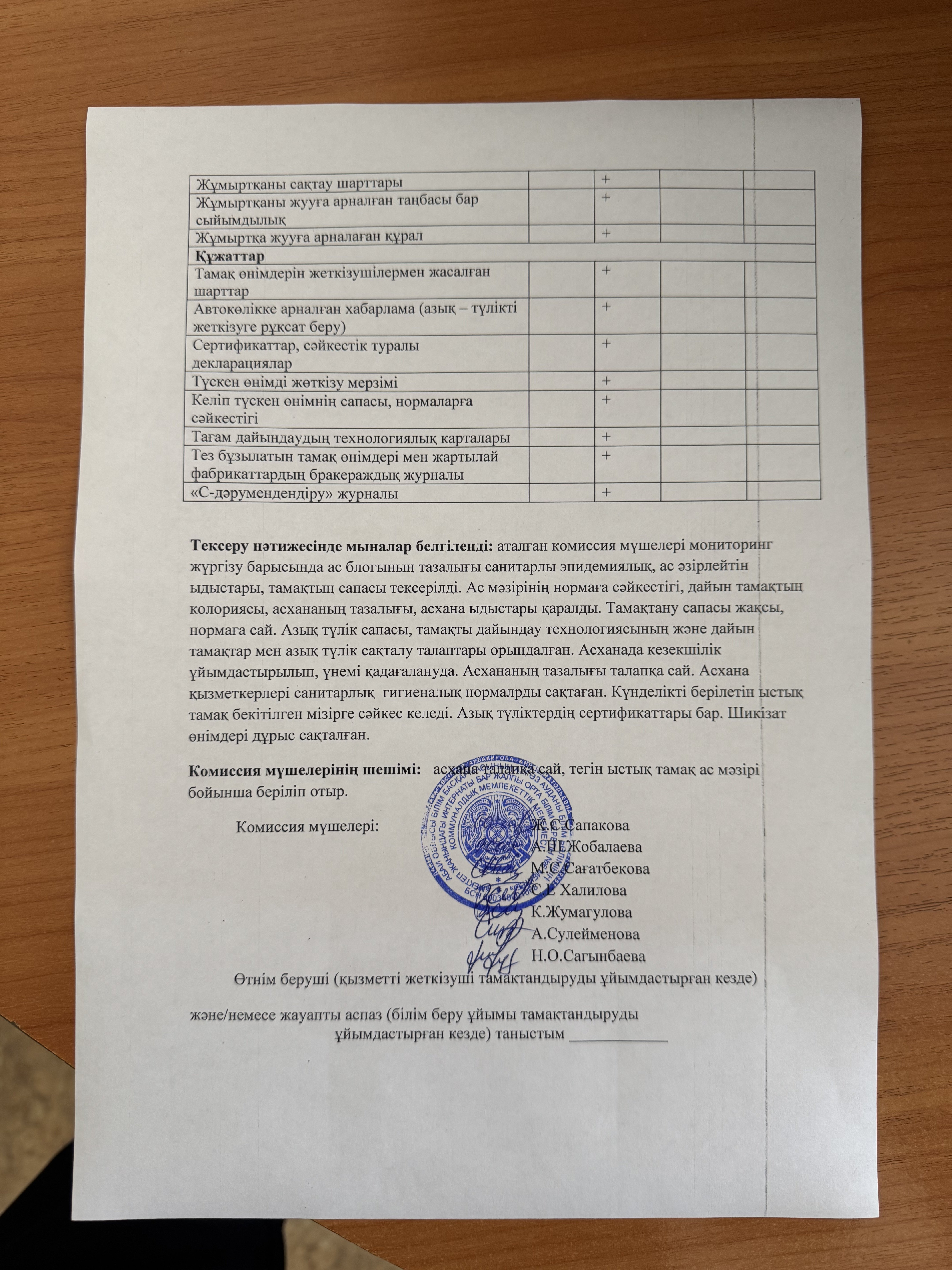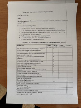 Тамақтану сапасының мониторинг жүргізу актісі.Хаттамасы