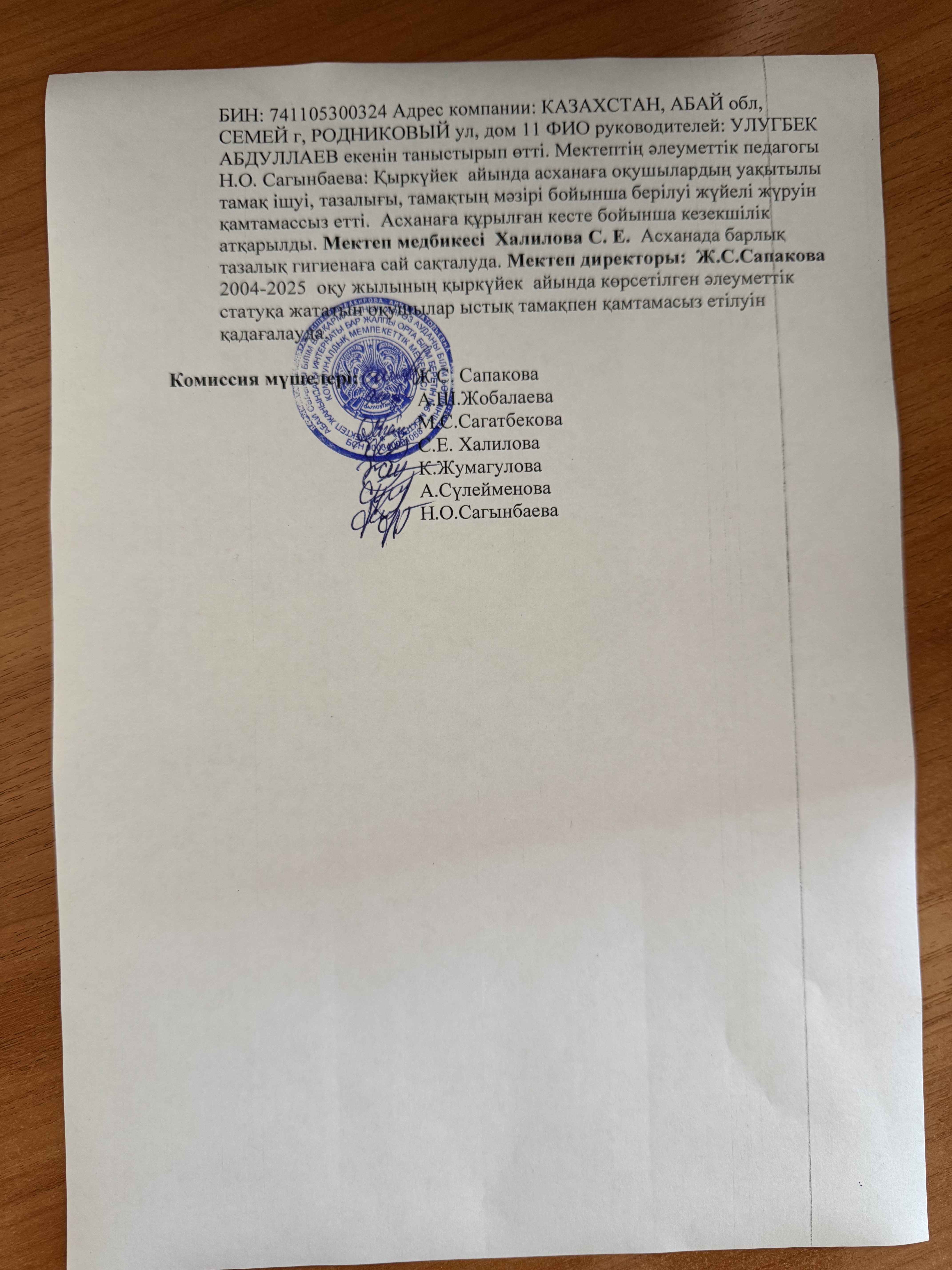 » Тамақтану сапасының мониторинг жүргізу актісі.Хаттамасы