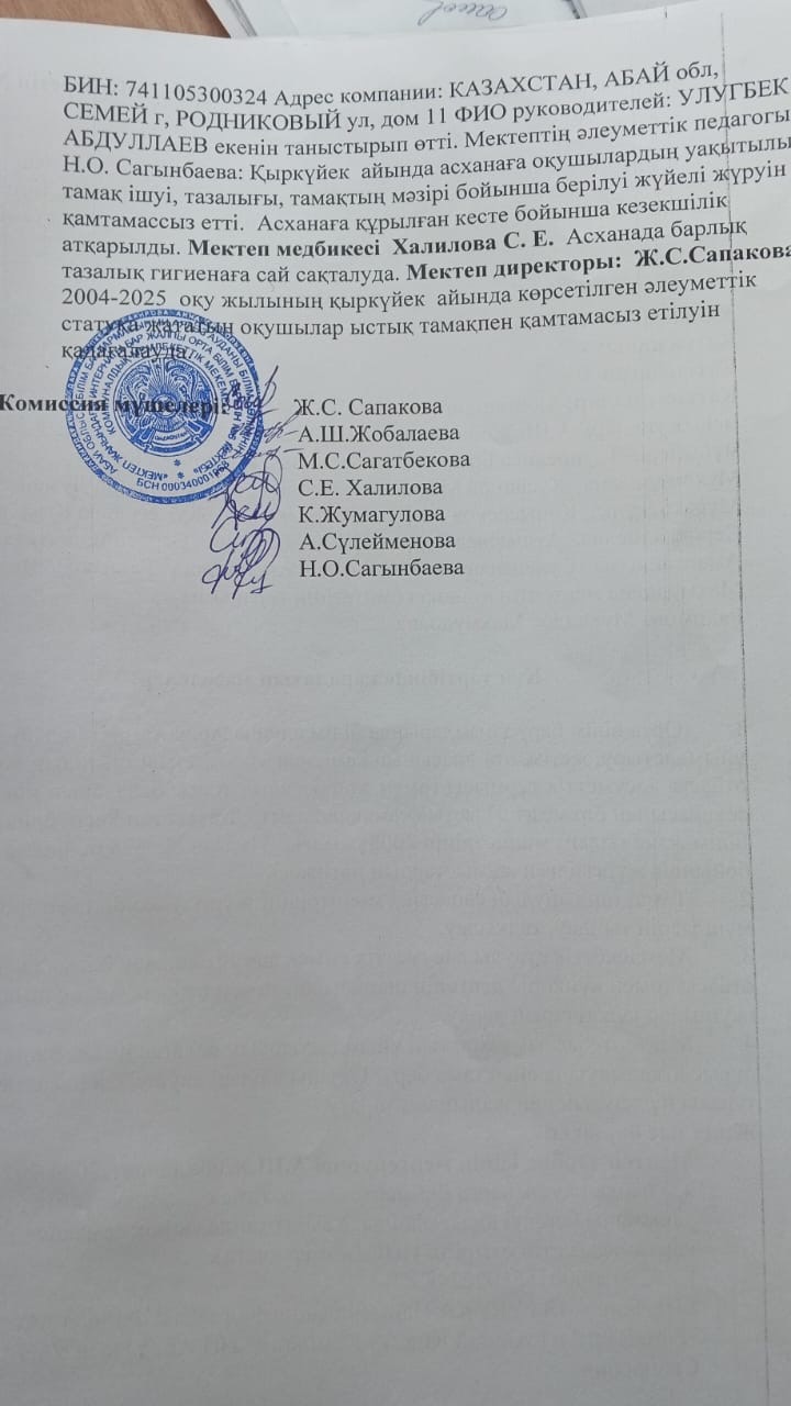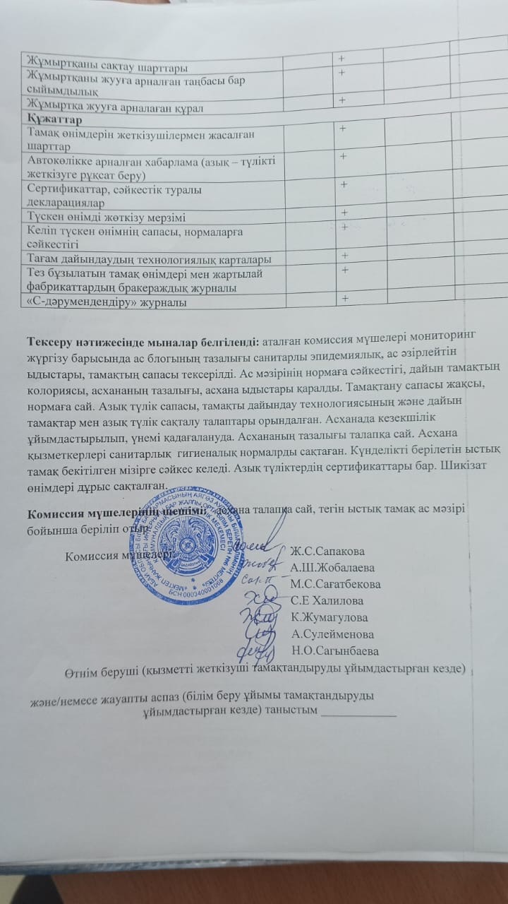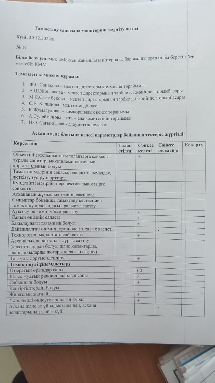 Тамақтану сапасының мониторинг жүргізу актісі.Хаттамасы