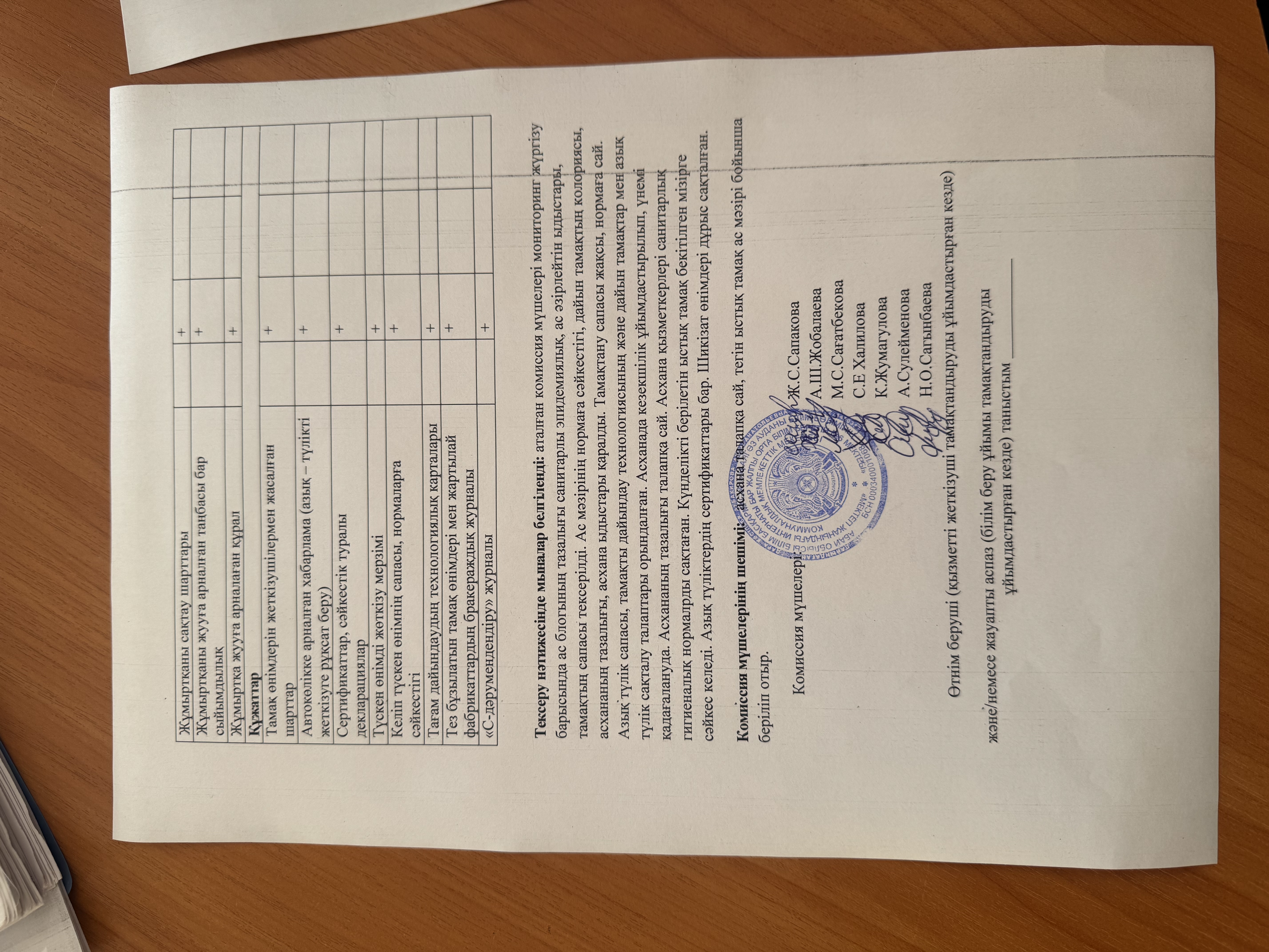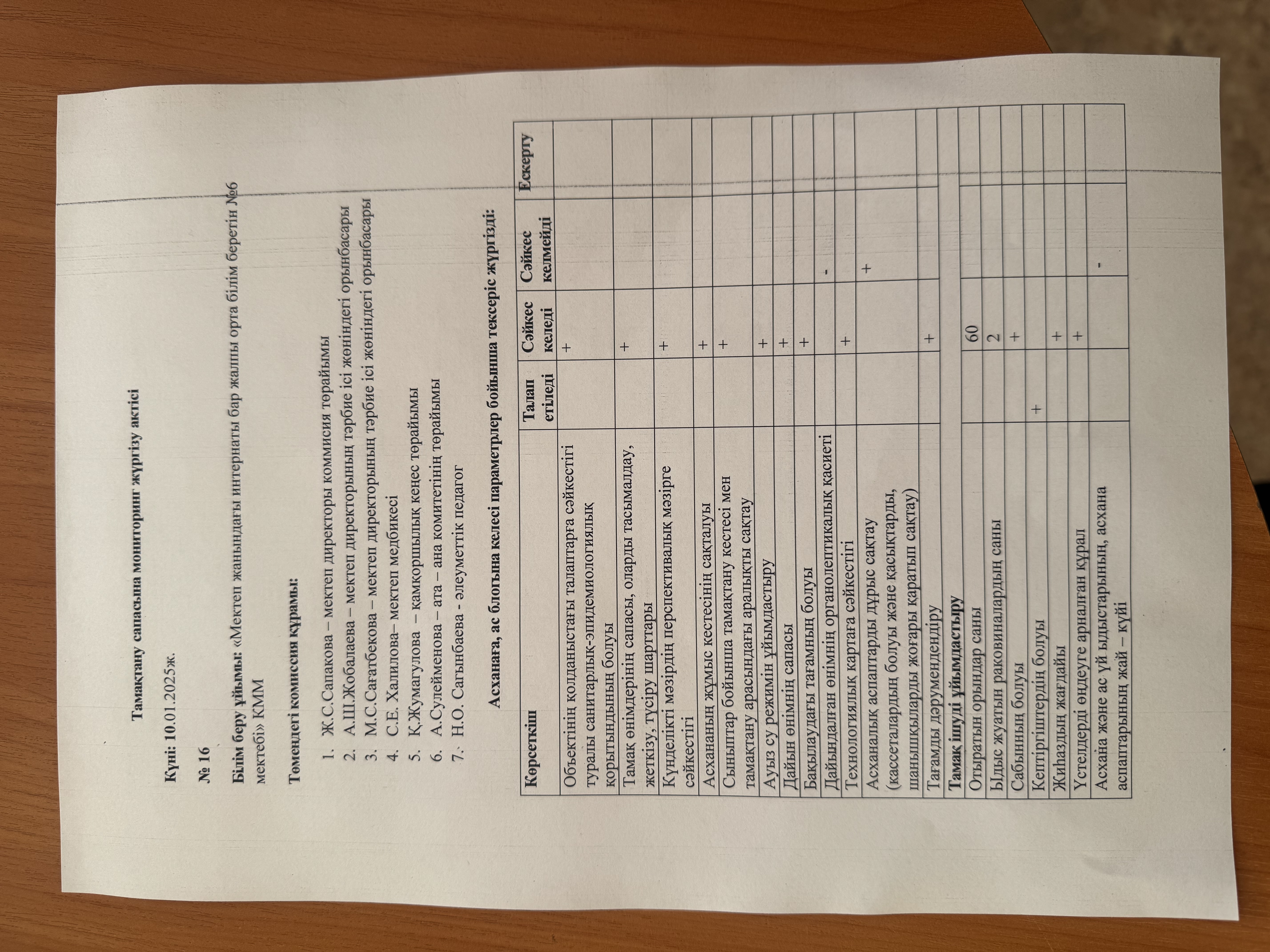 Тамақтану сапасының мониторинг жүргізу актісі.Хаттамасы