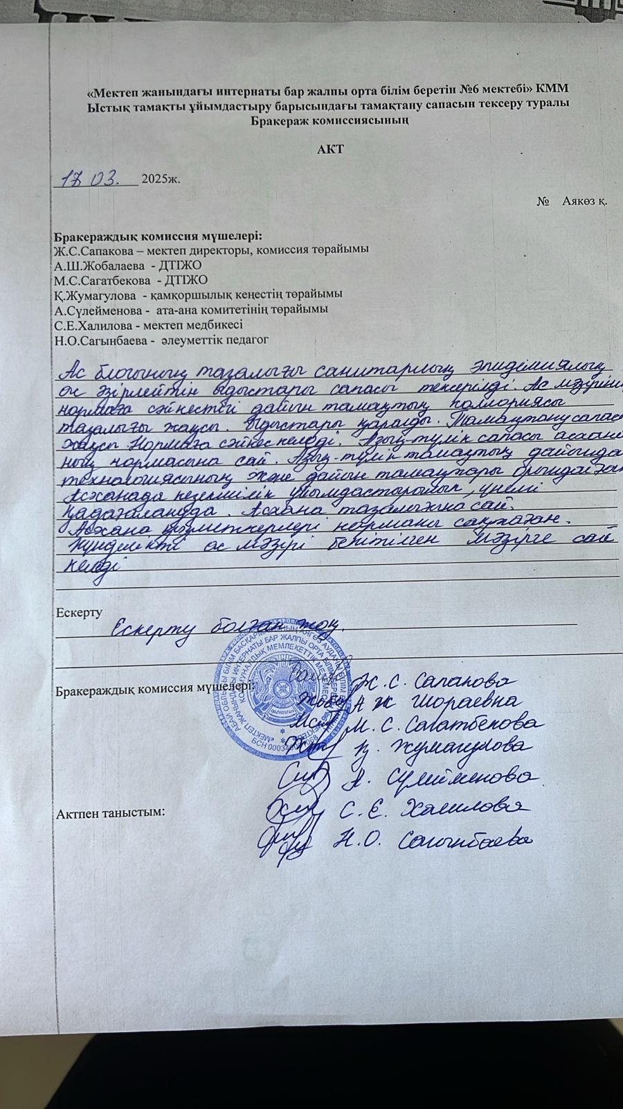 Абай облысы, Аягөз ауданы, “Мектеп жанындағы интернаты бар жалпы орта білім беретін №6 мектебі” КММ-де Оқушыларға берілетін ыстық тамақ бойынша барлық жұмыстар уақытылы жүргізіліп отыр