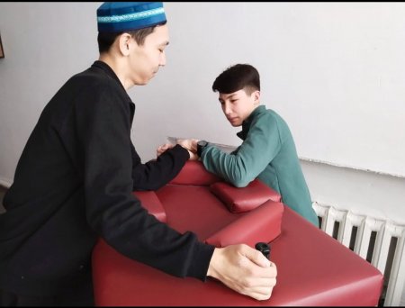 денешынықтыру пәні мұғалімі Окашев Есбол “Қол күрес” ойынынан жарыс ұйымдастырды.