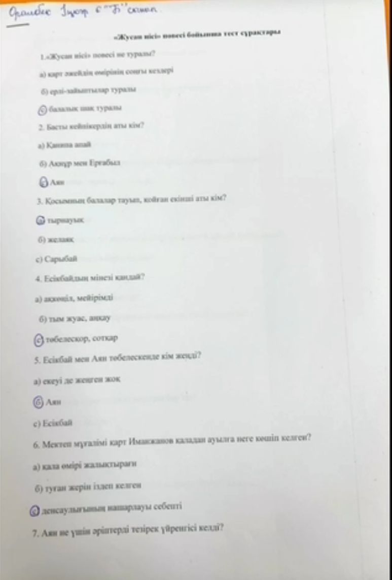 6 сынып оқушыларымен Сайын Мұратбековтың “Жусан иісі” повесін оқи отырып, тест сұрақтарына жауап алынды