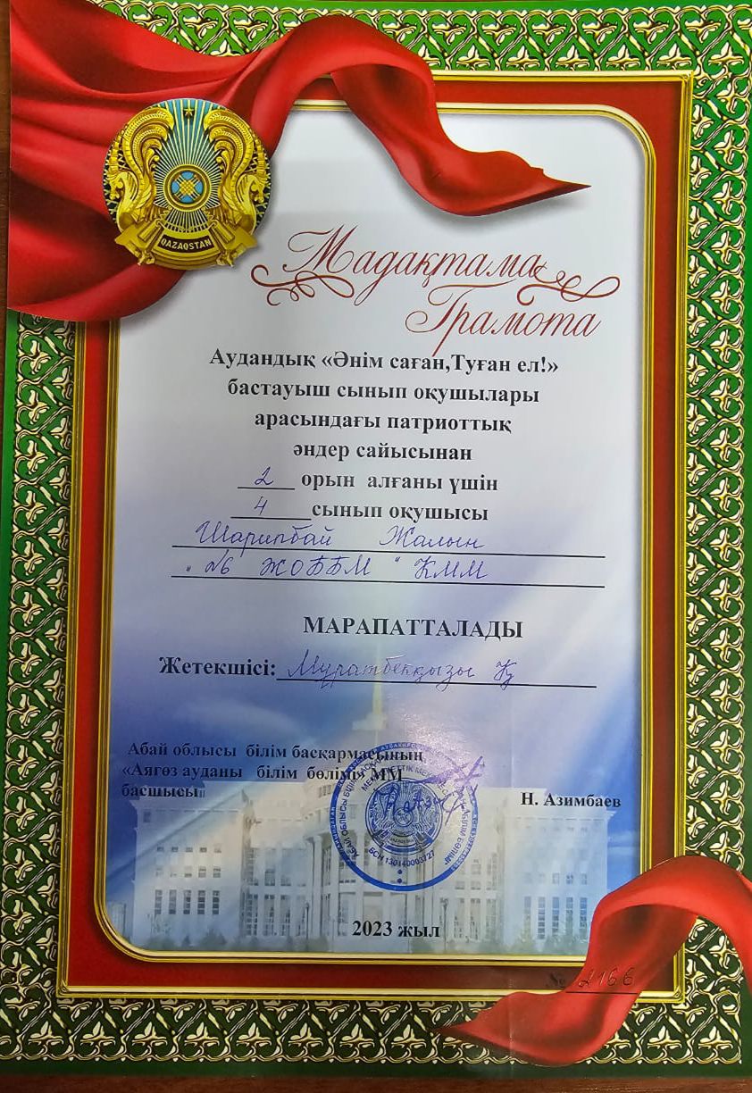 Аудандық “Әнім саған, туған ел!” бастауыш сынып оқушылары арасындағы патриоттық әндер сайысына 4 сынып оқушысы Шарипбай Жалын қатысып II орын иеленді.