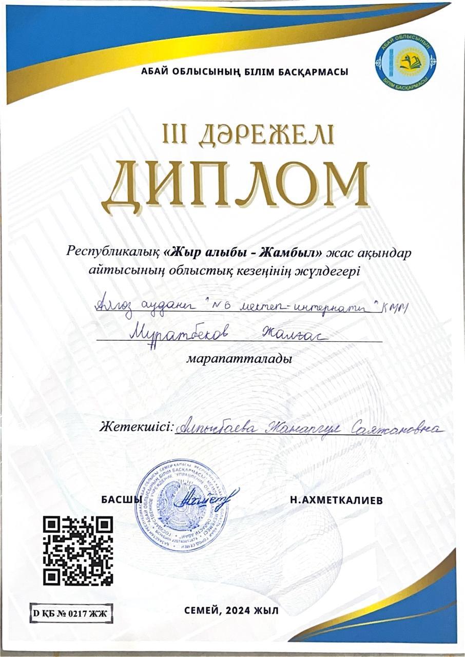 Республикалық “Жыр алыбы-Жамбыл” жас ақындар айтысының облыстық кезеңіне мектебіміздің 9- сынып оқушысы Мұратбек Жалғас қатысып III дәрежелі дипломмен марапатталды.