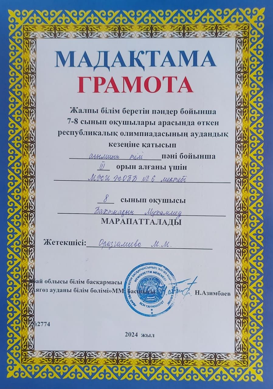 Абай облысы білім басқармасының Аягөз ауданы білім бөлімінің «Мектеп жанындағы интернаты бар жалпы орта білім беретін № 6 мектебі»
