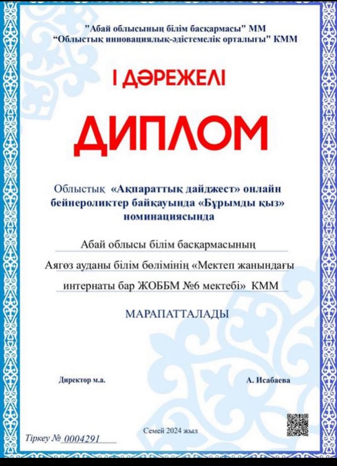 Абай облысы білім басқармасы Аягөз ауданы білім бөлімінің “Мектеп жанындағы интернаты бар жалпы орта білім беретін №6 мектебі” КММ-сы I орынды иеленді.