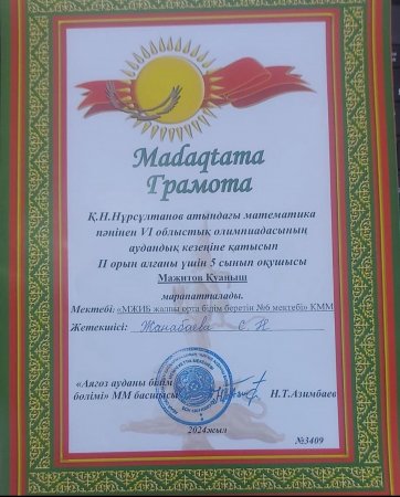 Қ.Н.Нұрсұлтанов атындағы математика пәнінен VІ облыстық және “Алтын сақа” олимпиадасының аудандық кезеңіне 5 сынып оқушысы Мажитов