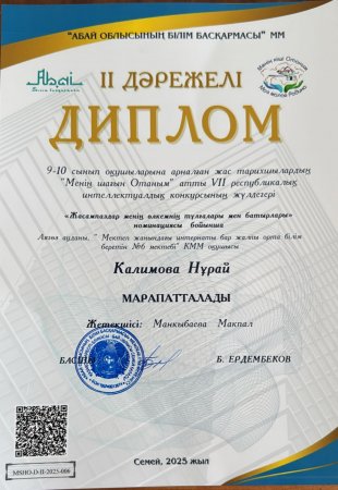 II облыстық “Кәмен оқулары” байқауының аудандық кезеңінде “Жазушы Кәмен Оразалиннің шығармашылығы” бөліміне қатысып, 9 сынып оқушысы